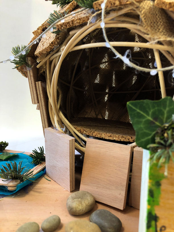Une première série d’ateliers se déroule dans 3 écoles primaires aux alentours de Villefontaine. Nous y travaillons des collages autour de l’imaginaire de la cabane, puis passons à la 3D avec des maquettes sommaires. A l’issue de chaque atelier, les 1ers dessins sont redistribués à la classe suivante, qui se doit de s’en inspirer, et/ou de les traduire en volume. Ce sont 8 dessins qui sont finalement proposés à 2 classes de 5e du Collège des Allinges. Ces derniers les traduisent en maquettes plus poussées, explorant structure, matérialité… Les 8 maquettes finales sont exposées au collège et sont soumises au vote ; la maquette gagnante inspire le dessin de la cabane finale.