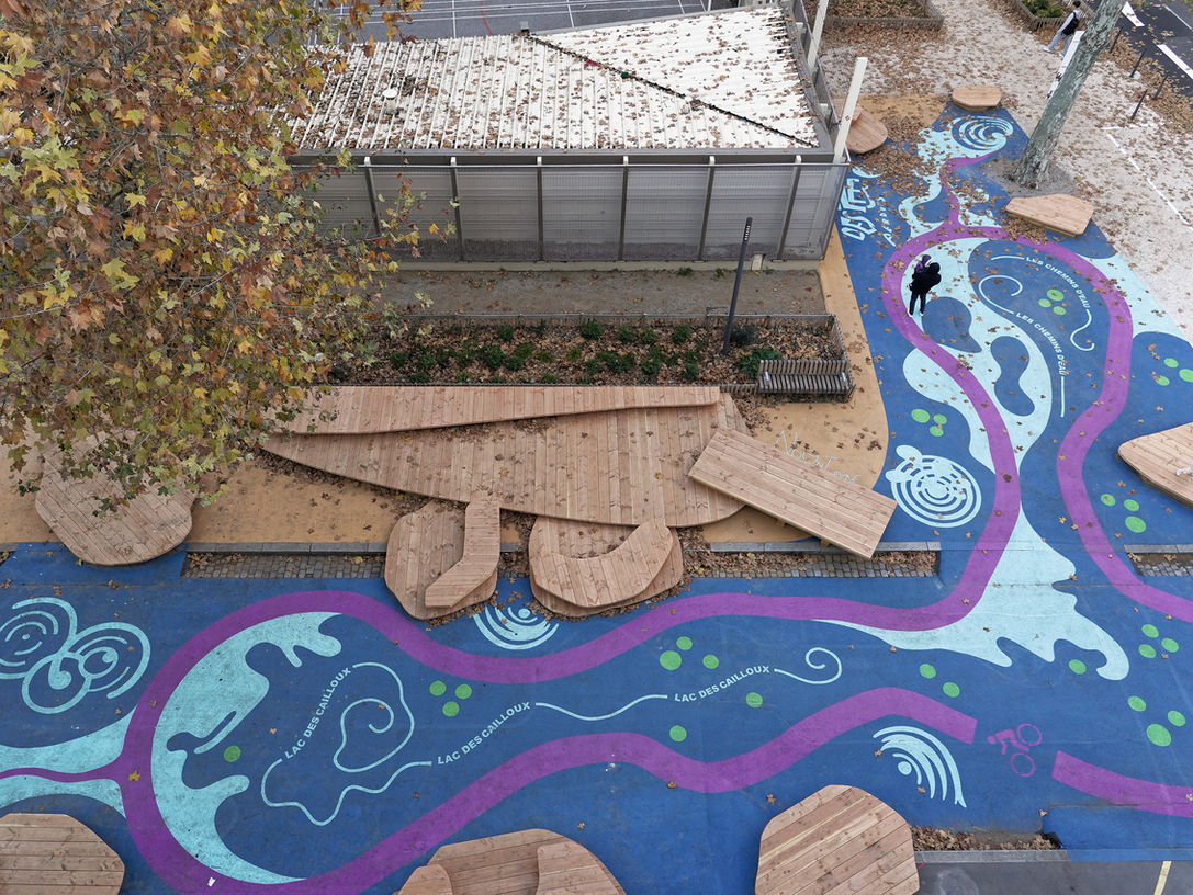 Nous constituons un groupement avec Valérie Simoncelli, artiste illustratrice ayant régulièrement mené des projets co-construits avec le jeune public, et notamment des réalisations dans le cadre du dispositif « rue aux enfants », en lien avec des établissements scolaires. Nous avons des approches communes et complémentaires de la co-construction mais sommes confrontés au même dilemme face au cadre du marché : comment être ambitieux dans la co-production avec les enfants, tout en étant contraints à produire une image du projet dès la phase offre ? Nous décidons de faire appel à l’imaginaire de la rivière, en référence au nom d’une rue voisine de l’école (rue de la Rize) qui suit le tracé historique d’un cours d’eau du même nom aujourd’hui enterré dans cette partie de la ville. Le tronçon de rue piétonnisé traversé quotidiennement par les enfants pour se rendre en récréation deviendra donc un paysage de rivière, avec son lit, ses berges, des émergences suggérant des rochers, son ponton, etc… Le travail en atelier avec les élèves de CM1 se concentrera sur la représentation du mouvement de l’eau à travers les différents courants artistiques et sur le champ lexical attaché à la rivière. Les formes produites en classe (dessins d’ondes, calligrammes) seront ensuite positionnées sur plan et testées in situ pour être intégrées au dessin final de l’œuvre. Notre proposition est finalement retenue par la SPL et les ateliers sont menés sur la fin d’année scolaire 2024-2025. Le temps pour nous d’affiner la conception technique du projet qui se déclinera en deux grandes briques : la peinture au sol de la chaussée et d’une partie des trottoirs, et la réalisation des plateformes en bois pour finir de construire ce paysage de rivière en permettant à une variété d’usages de s’installer (assises pour attendre la sortie des écoles, gradins dans le cadre de la classe dehors, piste d’apprentissage du vélo, zone de jeu libre, etc…).