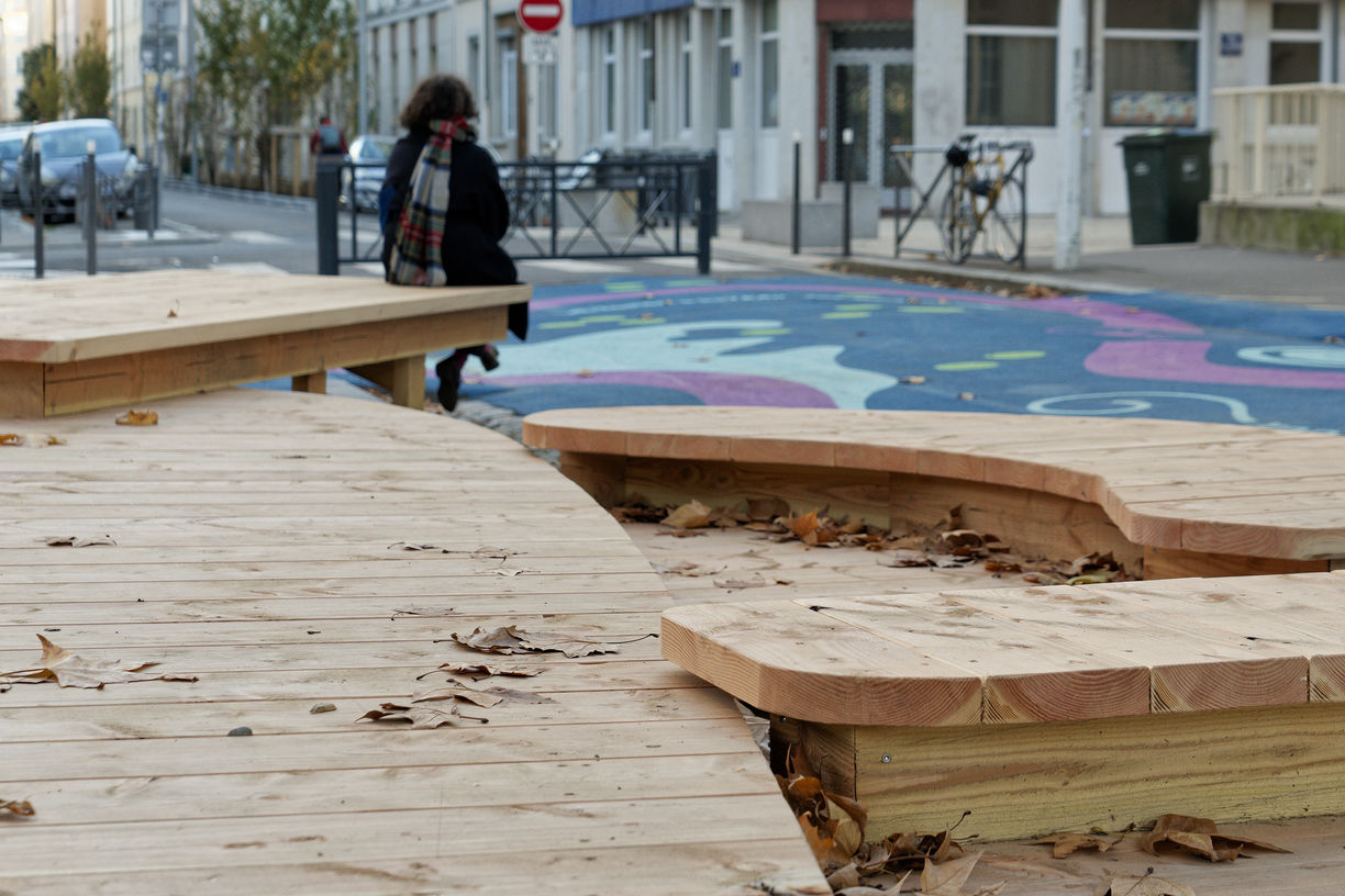 La peinture est réalisée par une entreprise spécialisée (Rhône-Alpes Signalétique) en suivant la direction artistique de Valérie Simoncelli ; les mobiliers sont eux directement construits sur site par le collectif Pourquoi Pas (avec l’aide précieuse de bénévoles, merci à elles.eux !). Les deux derniers jours de chantier sont banalisés pour terminer les réalisations avec les élèves impliqués l’an dernier et aujourd’hui en CM2. Dans un format chantier participatif accompagné, chaque groupe a en charge le débit et l’assemblage d’un des derniers niveaux de « rochers » habillant la rue transformée.