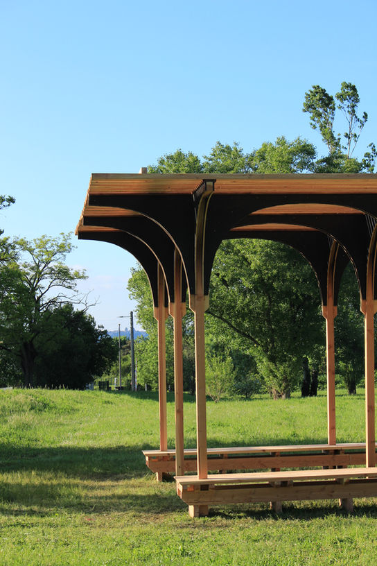 Dans le cas précis de la prairie de la Berthaudière, cette grande étendue herbeuse qu’on se proposait d’agrémenter d’un aménagement, c’est le manque d’ombre qui nous a été indiqué en grande priorité : un espace convivial, oui, mais sans ombre, impossible de le fréquenter ! Nous imaginons donc une option Maxi Toiture supportée par une structure façon sheds, et une option espace convivial ombragé, empruntant au vocabulaire arrondi du kiosque. Bien que la Maxi Toiture soit source d’un enthousiasme non négligeable, la Ville préfère le vocabulaire du kiosque. Bon, à nous d’être créatifs… On imagine donc un entre-deux, dont le plan carré est adouci par des arches en plein cintre de contreplaqué qui coiffent les poteaux (on croirait presque l’Alhambra de Grenade, non ?). Nous déployons avec ce système ingénieux quelques 80m² de brise-soleil en liteaux en 5 jours de chantier.